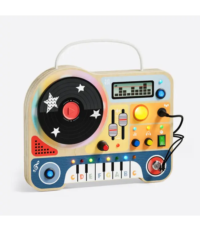 De Topbright Busy Board DJ is een uniek houten speelbord dat peuters en kleuters uitnodigt om spelenderwijs te ontdekken, voelen en experimenteren. Geïnspireerd op een echte DJ-set biedt dit interactieve speelgoed volop mogelijkheden om te drukken, draaien en schakelen.