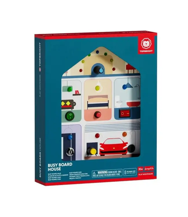 Het Busy Board House van Topbright is een interactief activiteitenbord waarmee kinderen spelenderwijs kunnen ontdekken en leren. Door schakelaars om te zetten, knopjes in te drukken en lichtjes te activeren, blijven kleine handjes actief bezig en worden nieuwsgierigheid en concentratie gestimuleerd.