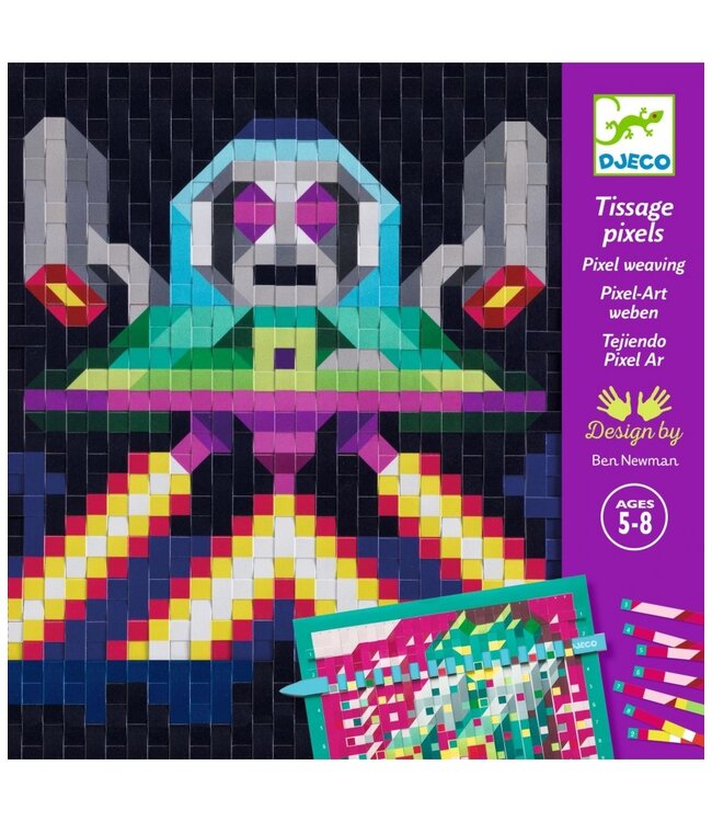 Ontdek de magie van pixel art met deze creatieve weefdoos van Djeco! Met de papieren stroken en het handige hulpmiddel schuift je kind de stroken in het genummerde en gedeeltelijk bedrukte raster. Stap voor stap verschijnen er kleurrijke schilderijtjes van coole robots, mysterieuze aliens en spannende UFO’s.