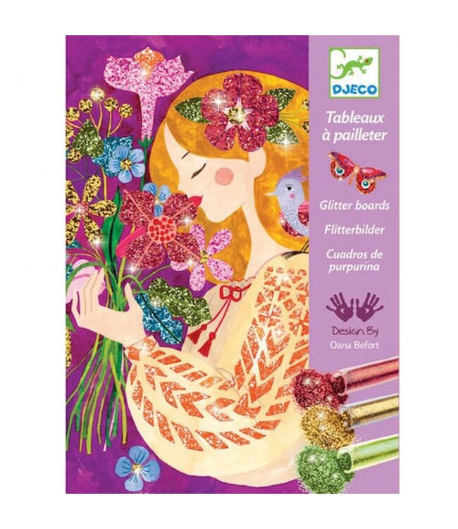 4 kleurplaten met charmante bloemenmeisjes die verlicht worden met kleurrijke glitter. De kinderen leggen hun tekening in de doos, maken de voorgelijmde vlakken open met het meegeleverde gereedschap en bestrooien ze vervolgens met glitterpoeder volgens de kleurcode in het boekje. Aan het einde van de activiteit glinstert het vredige landschap, tot groot vermaak van de kinderen!