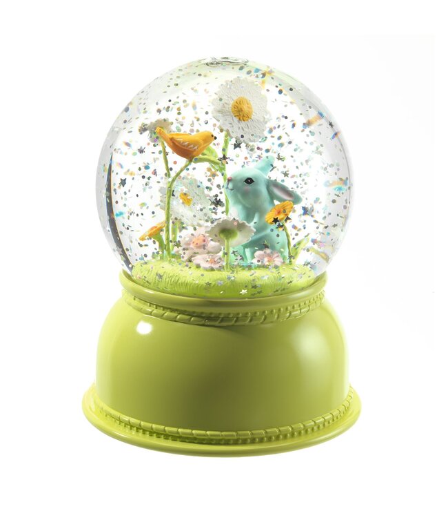 Deze betoverende sneeuwbol-nachtlamp van Djeco combineert sfeer en magie in één prachtig ontwerp. In het midden zit een lief konijntje, omringd door ronddraaiende glitters die fonkelen in het zacht veranderende LED-licht. Het stille mechanisme zorgt voor een rustgevend effect – perfect om bij in slaap te vallen.
