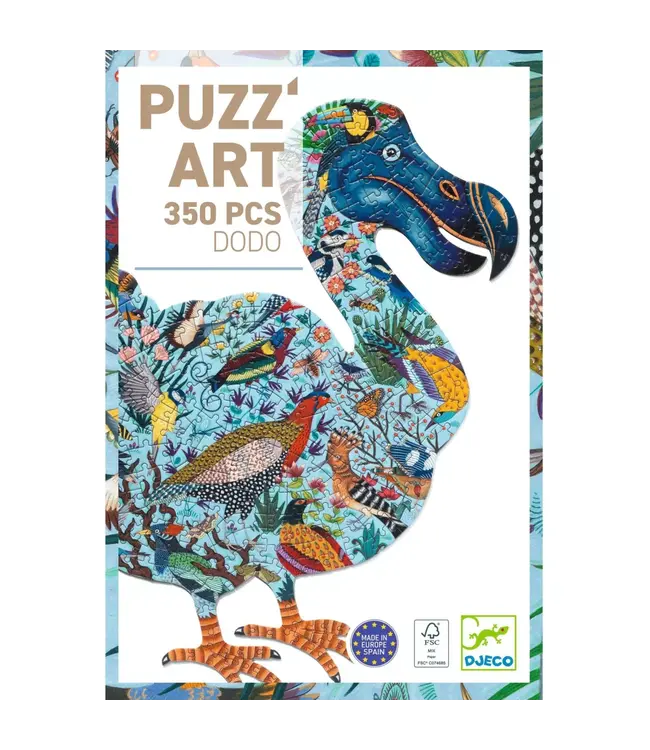 De Puzz'Art Dodo van Djeco is een puzzel met 350 stukjes. Deze puzzel heeft een uniek ontwerp zonder hoeken of randen, waardoor de kunst op een speelse manier verspreid is. In het grote opengewerkte silhouet ontdekt het kind een dodo, die zich in een levendige denkbeeldige wereld bevindt.