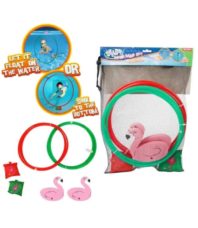 Duik in het plezier met de vrolijke SPLASH Flamingo duikset! Deze set bestaat uit twee grote duikringen van maar liefst 80 cm, perfect om doorheen te zwemmen onder water. Ideaal voor kinderen die graag actief bezig zijn in het zwembad.