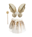 De bijpassende vleugels voegen een vleugje magie toe aan de set. Met een sprankelend gouden sequin-ontwerp geven deze vleugels een gevoel van lichtheid en betovering aan elke beweging. De set wordt vervolledigd met een toverstaf, gedecoreerd met glinsterende details die de verbeelding van kinderen stimuleren.