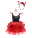 Het jurkje is gedetailleerd met de kenmerkende rode en zwarte stippen van een lieveheersbeestje, wat een charmant en opvallend patroon creëert. De zachte tule tutu voegt een vleugje meisjesachtigheid toe aan het geheel, terwijl de pofmouwtjes een extra schattig element bieden.