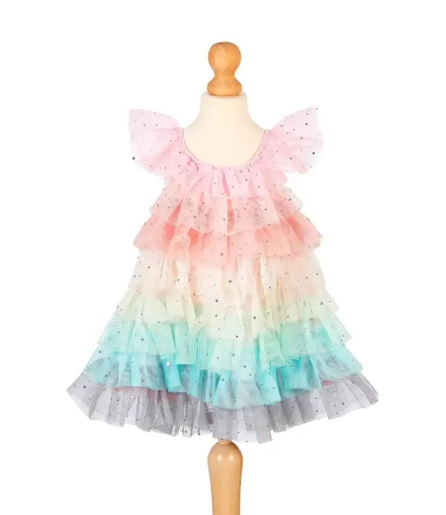 Laat je kleine prinses stralen in deze Souza Fenne feestjurk met prachtige regenboogkleuren! Perfect voor meisjes van 3 tot 4 jaar, deze jurk is een droom voor verjaardagsfeestjes, carnaval, verkleedpartijtjes of fotoshoots. De zachte tule en sprankelende regenboogaccenten maken elke beweging magisch en vrolijk.