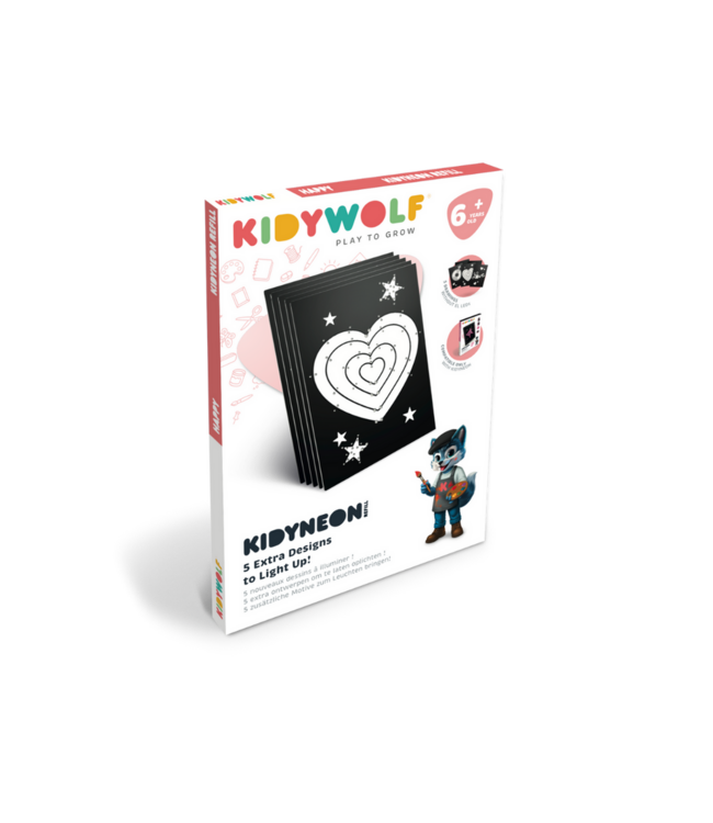 Verleng het creatieve avontuur met de KIDYNEON navullingen! Deze set bevat 5 nieuwe voorgeperforeerde borden met verschillende tekeningen, ideaal om eindeloos te blijven knutselen. Perfect om het plezier te verlengen, de creativiteit te stimuleren en telkens weer nieuwe, unieke kunstwerken te maken.