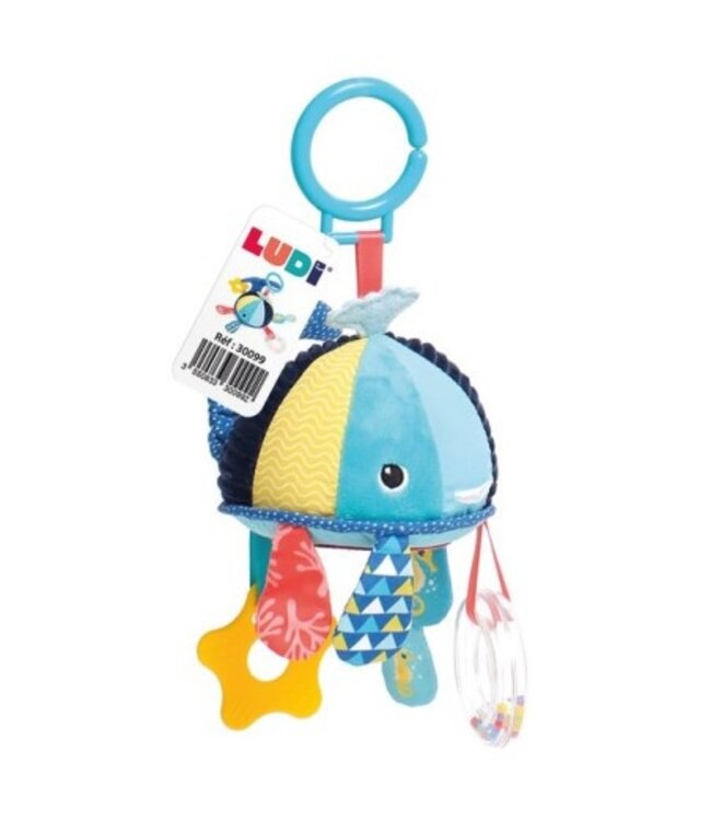 Hangactiviteit walvis is leuk! Deze hangende activiteitenwalvis is een leerspeeltje dat overal opgehangen kan worden. Met verschillende zintuiglijke activiteiten: een geluidenspel, verfrommeld papier, een bijtring en een spiegel waar baby mee kan spelen. De walvis en zijn hangende activiteiten houden baby bezig en stimuleren de zintuigen, de fijne motoriek en het begrip.