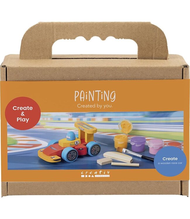 Met deze Creativity in a Box kunnen kinderen hun eigen speelgoed maken, schilderen en versieren. De set bevat houten elementen, verf, penseel, lijm en stickers, alles wat nodig is voor een compleet creatief bouwproject.
