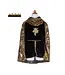 De set bestaat uit een zwarte velours tuniek met capuchon, een goudkleurige riddercape en een bijpassende gouden ridderkroon. Op de borst van de tuniek prijkt een glinsterend leeuwenembleem, terwijl de capuchon en lange mouwen zijn uitgevoerd in een realistische maliënkolder-look voor een authentieke ridderstijl.Â