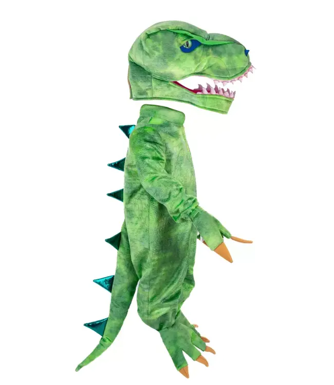 Een dramatische staart valt sierlijk langs de rug, afgewerkt met metallic groene stekels voor een extra stoere uitstraling. De pluche T-Rex-kop zit comfortabel over het hoofd en heeft grote ogen en woeste tanden, waardoor je dino-look helemaal tot leven komt. Perfect voor verkleden, rollenspellen of themafeestjes!