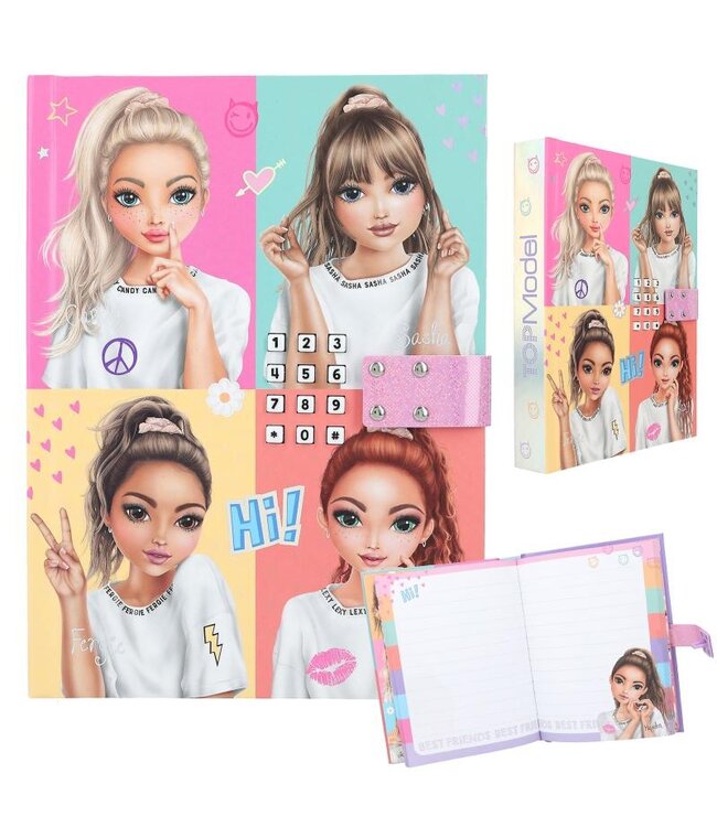 Coole foto's van de TOPModels: het dagboek met vier portretten van de TOPModels gaat alleen open als je de juiste 4-cijferige code invoert (persoonlijk in te stellen en te veranderen). Dan hoor je de hit Shivers voor ca. 20 seconden. Het dagboek heeft binnenin 80 fleurige pagina's met fijne lijntjes.
