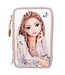 Fantastische flora! Het 3-vaks etui van TOPModel heeft op de voorkant een romantische modellenafbeelding met delicate bloemen en vlinders. De drie aparte vakken zijn compleet gevuld met 18 kleurpotloden, 18 viltstiften, 2 potloden, een puntenslijper, gum, liniaal, schaar, plakstift en een klein vakje met klittenband.
