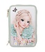 Het groene 3-vaks etui van TOPModel heeft op de voorkant een grote romantische modellenafbeelding met delicate bloemen en vlinders, waarvan sommige geborduurd zijn. De drie aparte vakken zijn compleet gevuld met 18 kleurpotloden, 18 viltstiften, 2 potloden, een puntenslijper, gum, liniaal, schaar, plakstift en een klein vakje met klittenband.