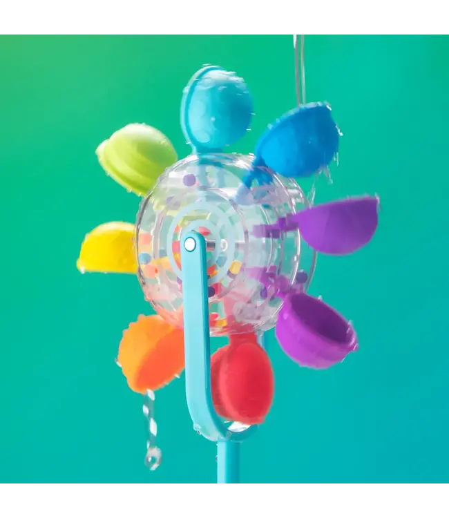 De Whirling Waterfall is een uniek badspeelgoed dat werkt op water en zorgt voor extra plezier tijdens het badderen. Door water over de gekleurde bekers te gieten begint het wiel te draaien en komen de regenboogkleuren tot leven.
