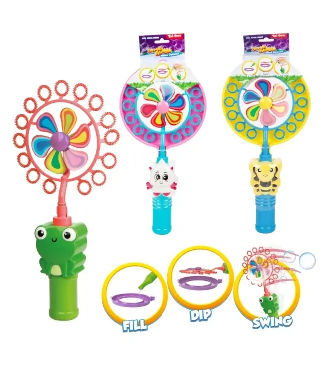 Breng extra plezier in buitenspelen met de bellenblaas molen! Deze vrolijke molen combineert het klassieke plezier van bellenblazen met het speelse effect van een draaiende molen. Vul het reservoir met bellenblaasvloeistof, zet de molen in beweging en zie hoe er een stroom van glinsterende bellen door de lucht zweeft.